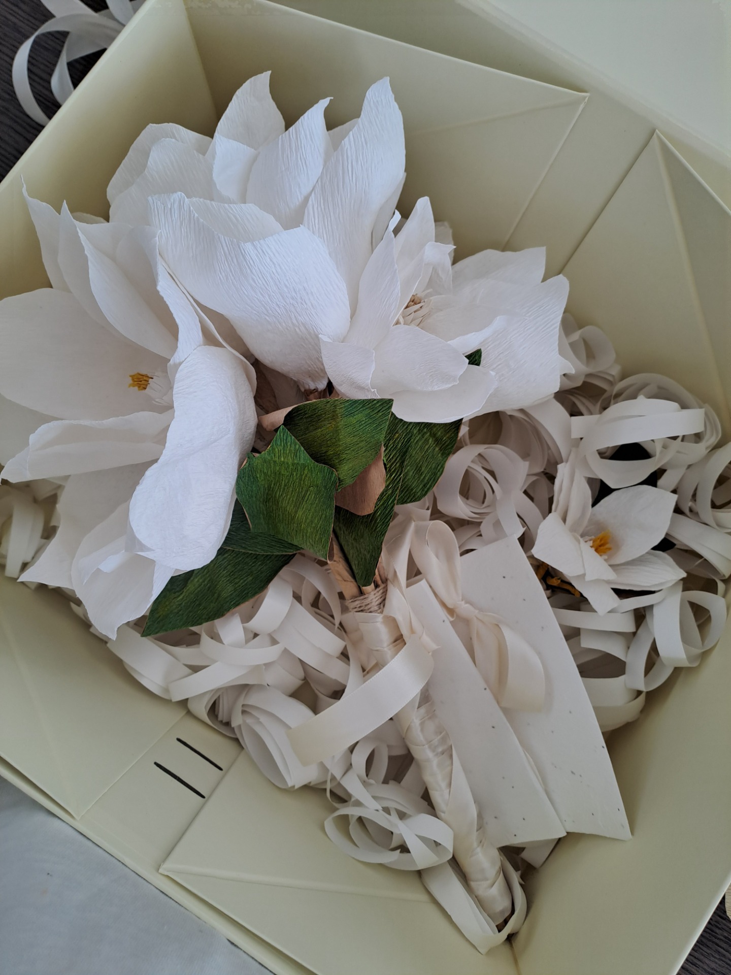 La sua eleganza lo rende ideale per le cerimonie, ogni dettaglio e' pensato per emozionare, fiori realizzati con cura fino a comporre un insieme armonioso avvolti da un morbido nastro in chiffon.